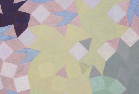 Egg tempera paintings by Eli Bornowsky depict fragments of procedural tessellations. Cropped into square dimensions, the geometric compositions could extend infinitely beyond the picture plane. For the artist, whose practice often draws on optical effects derived from mathematical systems, geometric operations are a way to problematize artistic self-expression, engaging instead with the physical manifestations of algorithmic logic. For instance, Bornowsky employs ‘space-filling curves’ and ‘random walk algorithms’ to determine the distribution of colour across tiles. Both describe the wandering path of a line: one continuous and exhaustive, the other partial and unpredictable. Within these parameters, Bornowsky’s brush follows similar trajectories—looping, meandering, and doubling back—revealing the restless motion of his constructed process. By merging geometric precision with intuitive improvisation, his paintings explore the knot of structure and chance, where each brushstroke translates mathematic procedures into laboured rhythm.