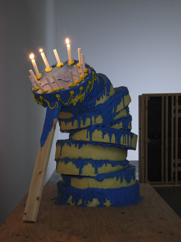 Abbas Akhavan, One Hundred Years, 2025, royal icing (confectioners’ sugar, egg whites, food colouring), stainless steel, hardware, oil lamp, paraffin oil, candles, lumber, dimensions variable