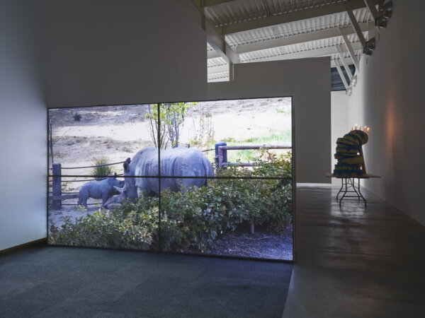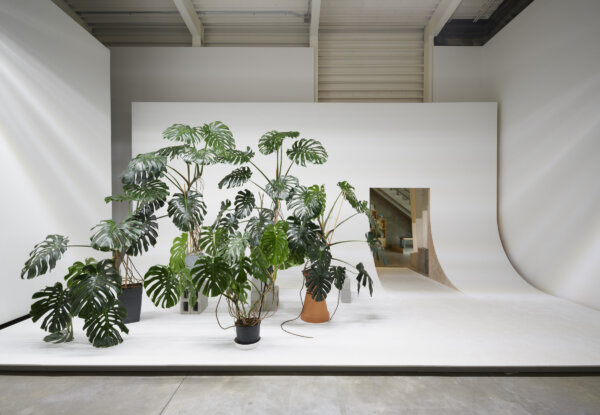 Abbas Akhavan, untitled, 2020, heavy-duty vinyl-reinforced polyester, quilt batting, tropical plants, glass, installation dimensions variable