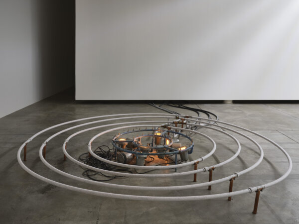 Abbas Akhavan, spring, 2021, frost, copper piping, freezing mechanism, cinder blocks, found water fountain piping, lights and pump, part 1. 148 in. diameter x 18 in. (375 cm diameter x 45 cm), part 2. 63 x 63 x 32 in. (160 x 160 x 80 cm) freezing mechanism