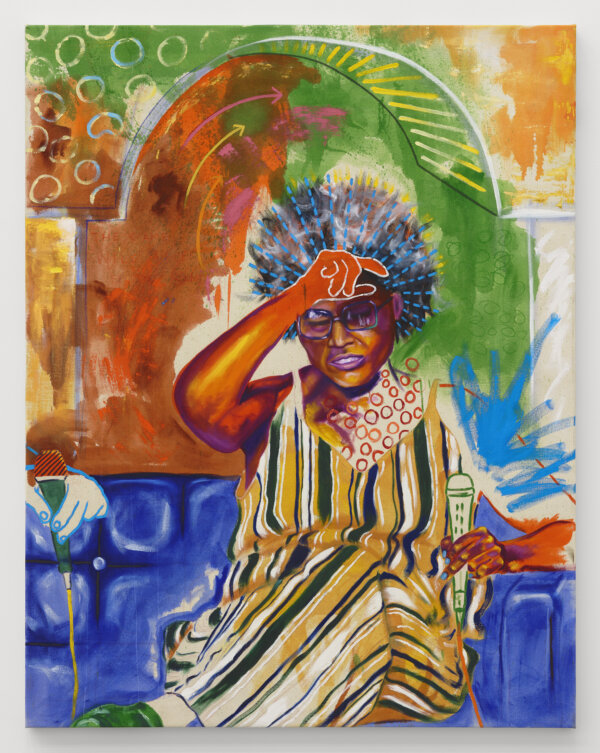 Chukwudubem Ukaigwe, Ain’t I at the Gate (Titled after Lubrin)?, 2023, oil on canvas, looping audio featuring Gil Scott-Heron, ‘Whitey on the Moon (A Capella)’ (1970), Charles Mingus, ‘Please Don’t Come Back from the Moon’ (1962), Dorothy Donegan, ‘How High the Moon’ (1959), Canisia Lubrin, ‘Voodoo Hypothesis’ (2017), Grover Washington, ‘Moonstreams’ (1975), Ornette Coleman, ‘Moon Inhabitants’ (1970); 9 minutes, 32 seconds, 72 x 60 in. (183 x 152 cm)