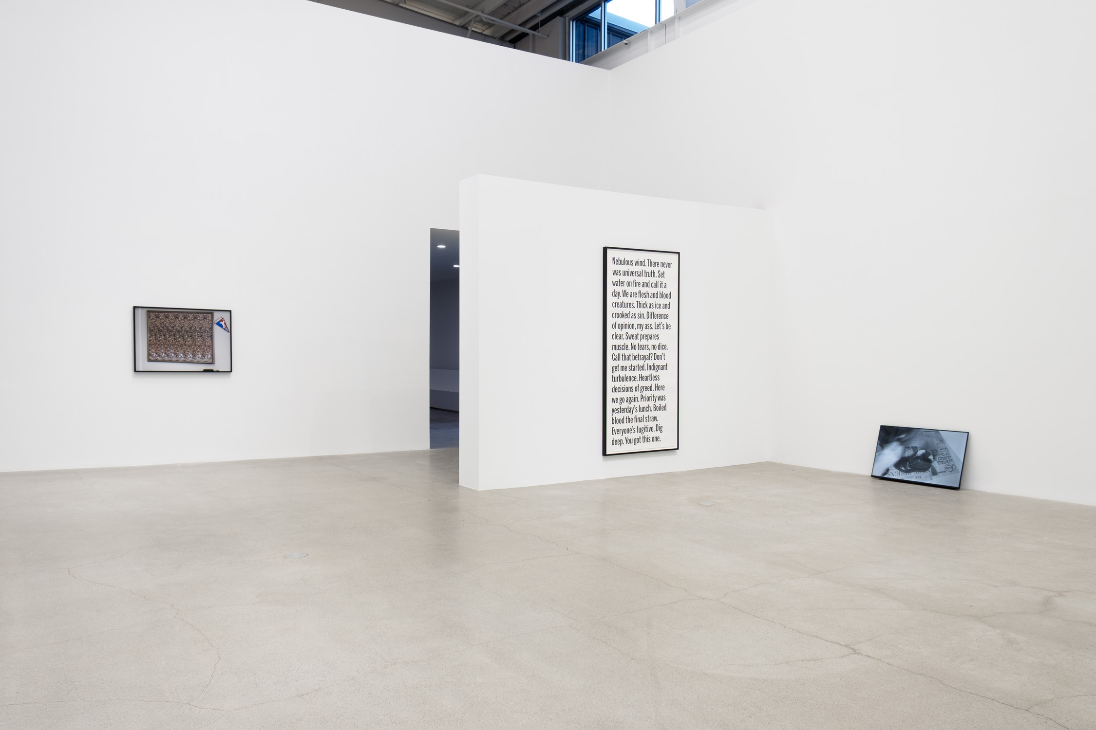 History may be written by the victors, but it is destined to be reinterpreted by its spectators. What remains are fragmented narratives—which circulate by way of school curricula, personal testimonies, and conspiratorial forums alike. Janice Kerbel’s Rants (2025) comprise numerous one-liners and non-sequiturs agglomerated into literal walls of text. The pronouncements use the language of authority, an aggressive tone that captures attention through performative soliloquies. Certain phrases flare up amid the attenuated idioms: ‘Time teaches nothing.’ ‘You cannot step in the same river twice.’ ‘There never was a universal truth.’ But the dense and ragged typeface reads less like what would be carved in stone or stamped in press, and more like what would be pasted upon a billboard. The result is a sense of time propelled not toward resolution but toward accumulation: a temporal arrow shaped by consumerist society and oriented toward absence, urgency, and desire.